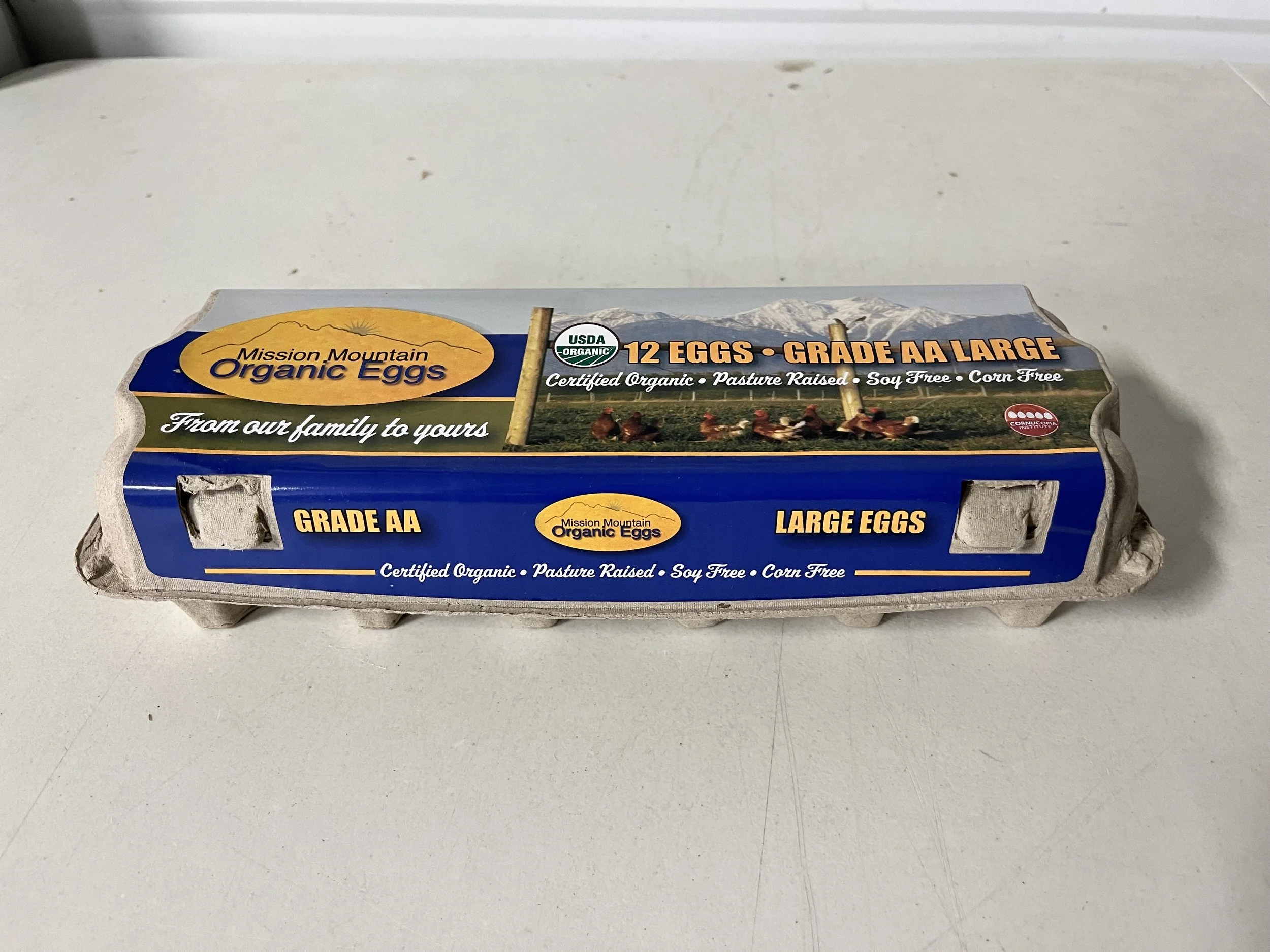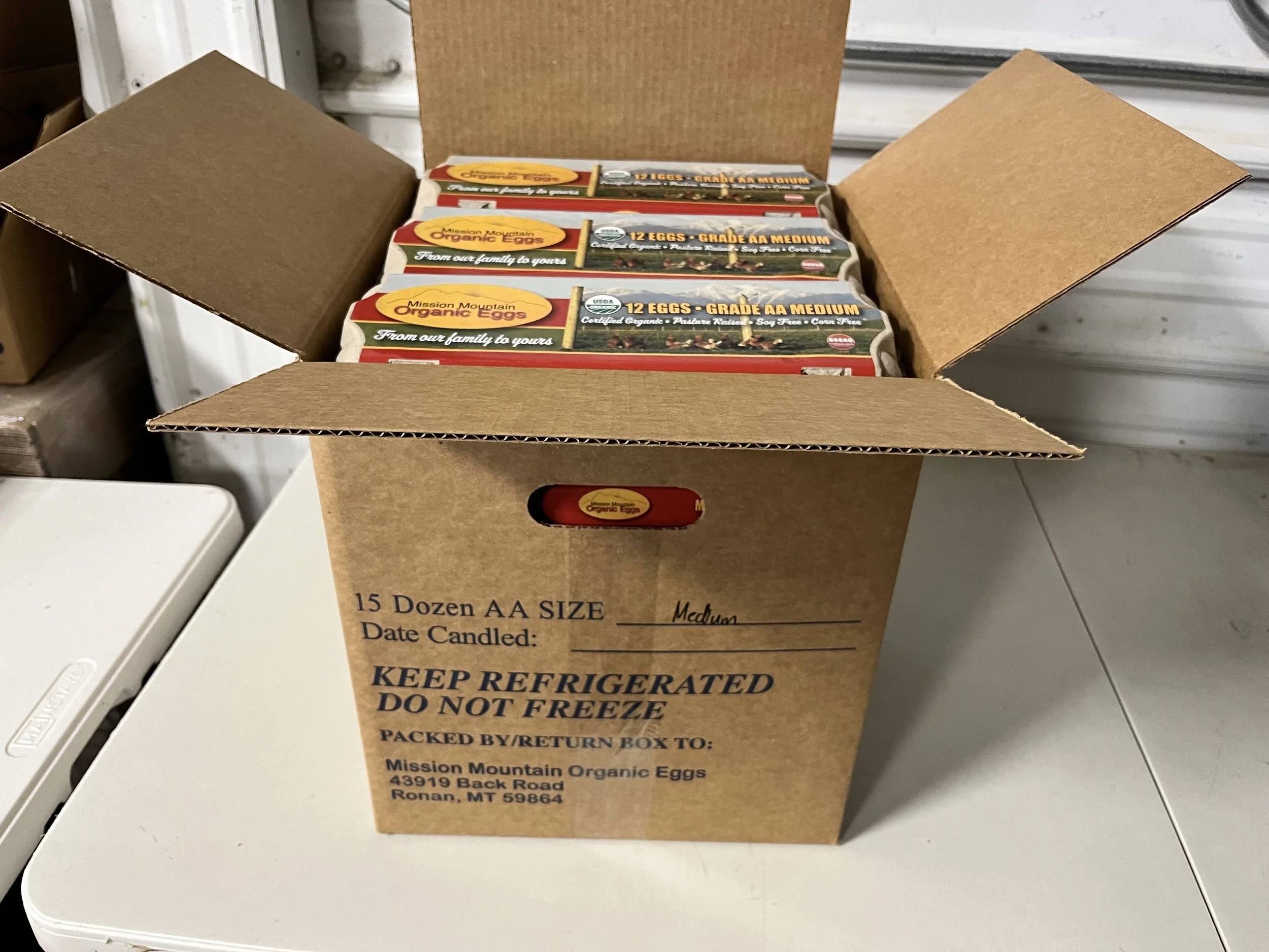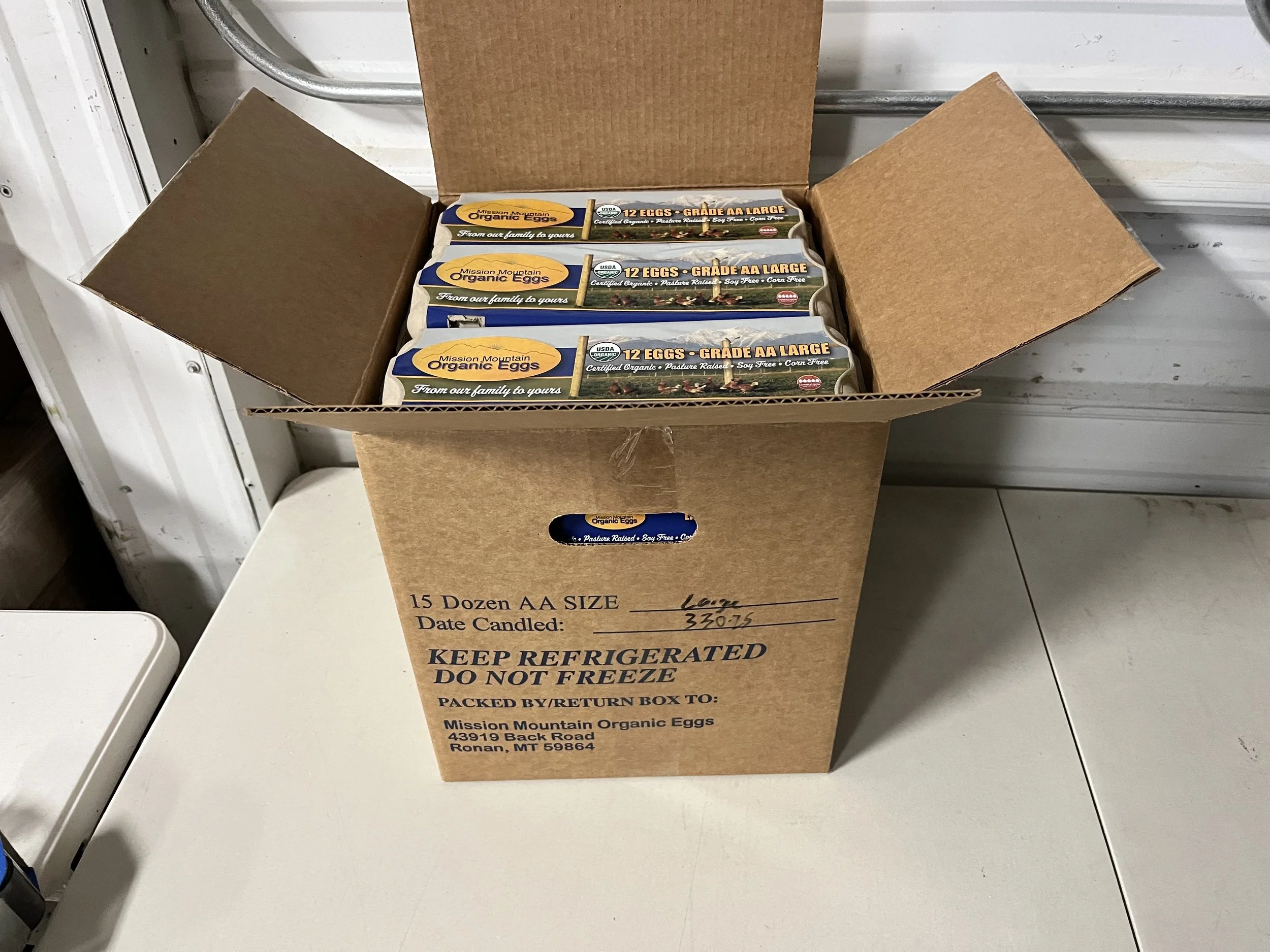 Fifteen dozen eggs in 12 egg cartons. Certified Organic, soy free, and corn free. Available for pickup only. Shipping not available.